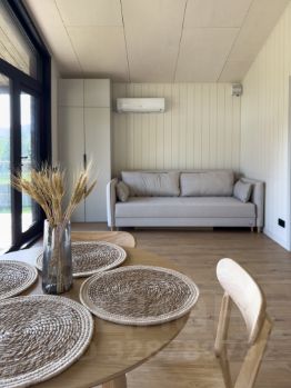 Дом построен по технологии теплого каркасного домостроения. Три комнаты: спальня , просторная кухня гостиная и санузел. Планировка удобная, в доме сухо и тепло. Сделан дизайнерский ремонт а так же полностью с мебелью и со всем необходимым для жилья. Все новое. В доме панорамные окна из которых вид на лес и горы!