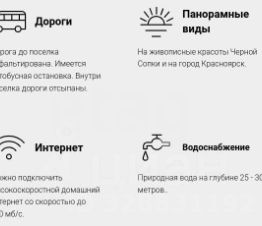 Подъездной путь к посёлку по асфальтированной дороге, внутри посёлка дороги отсыпаны и чистятся круглогодично. На въезде в поселок установлены электрические ворота и видеонаблюдение. Электричество к каждому участку уже проведено государственной компанией МРСК Сибири. Подключение 220 Вт либо 380 Вт на выбор по заявлению. Водоснабжение через индивидуальные скважины - глубина залегания около 25 - 30 метров.