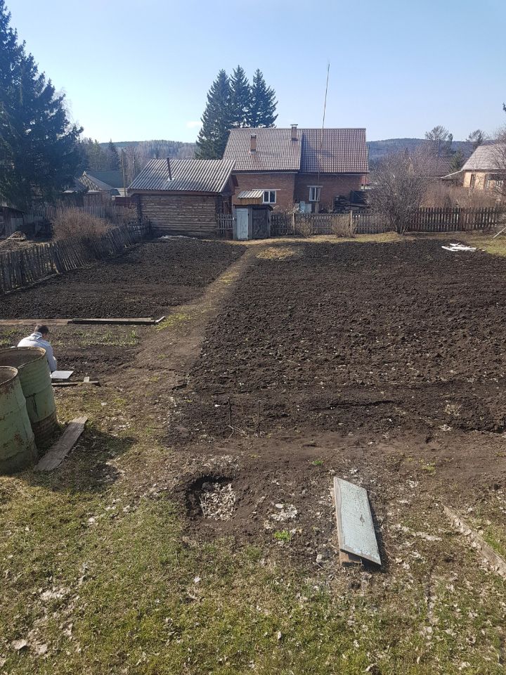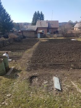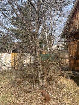 Участок: Земля готова под огород (лишь небольшая часть в траве). Уже растут: черноплодная рябина, ярга, малина, кислица, смородина.