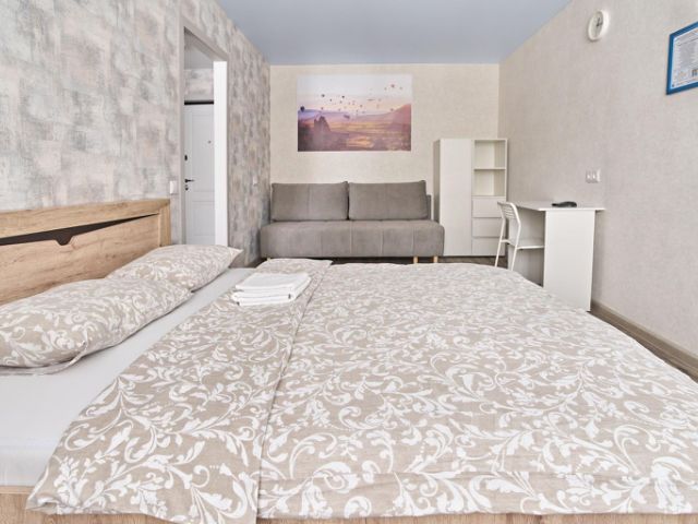 Квартиры представляет собой уютное и просторное жильё с современной мебелью и бытовой техникой. Здесь есть всё необходимое для комфортного проживания: удобная кровать, вместительный шкаф, телевизор, холодильник, стиральная машина и многое другое. На кухне есть вся необходимая посуда и техника для приготовления пищи, в том числе: чайник, плита, микроволновка, холодильник. В квартире есть фен. Имеется цифровое ТВ и Wi-Fi
