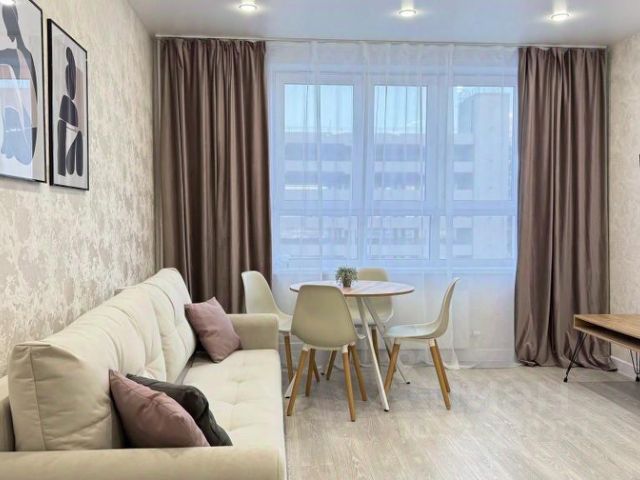 Новая просторная и очень уютная 1-комнатная квартира с необычной планировкой площадью 52 кв. М. Расположена на 15 этаже, из окна (особенно в темное время суток) открывается прекрасный вид на город. Комната оборудована 4 спальными местами: 2-х спальная кровать размером 160200см с ортопедическим матрасом; Диван Имеется напольная вешалка для вещей, комод. Кухня состоит из 2-х помещений, поделенных на зону, оборудованную всей необходимой техникой и посудой для приготовления еды, и столовую зону. Помещение санузла просторное и оборудовано окном. Квартира со свежим ремонтом. Новый район города с развитой инфраструктурой и удобной транспортной развязкой. В непосредственной близости находятся автобусные и трамвайные остановки, гипермаркеты "лента" и "метро", термальный комплекс "сибирские термы", детский кинотеатр "мечта", парк "сибсталь". В 15 минутах езды о. Татышев.