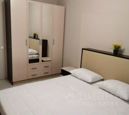 Обеденная группа в центре разделяет кухню и гостиную. На стену по запросу арендатора можно разместить телевизор. Из этой комнаты есть выход на застекленный балкон. Следующая комната спальня, в которой разместилась просторная кровать два на два метра в размерах с тумбами по краям и светильниками, шкаф для одежды, тумба со стеклянной дверью для хранения и комодом.