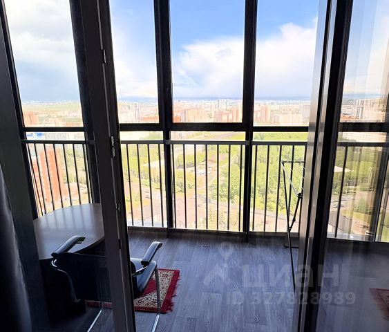 Балкон: застеклённый, с ковром на полу и сушкой для белья.