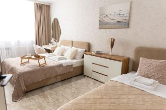 Две комнаты, двуспальная кровать + 1 раскладной диван. Будет комфортно разместиться 2-4гостям. Для вас готово свежее постельное бельё (100%-й хлопок) и полотенца. В квартире есть ванна. Техника: холодильник, чайник, плита, духовка, микроволновка, стиральная машина, утюг, фен, водонагреватель. Есть всё для приготовления еды, а также сушилка и гладильная доска. Интернет: высокоскоростной Wi-Fi от GoodLine. Есть телевизор с кабельным ТВ и функцией "Смарт-ТВ"! В подарок: разовые средства гигиены (шампунь, гель для душа, жидкое мыло, зубной набор).